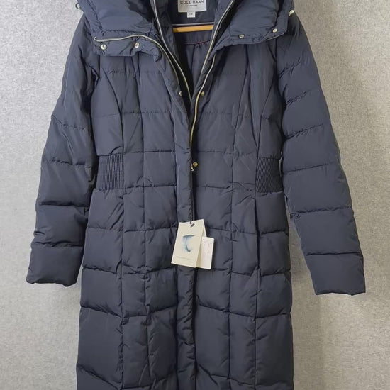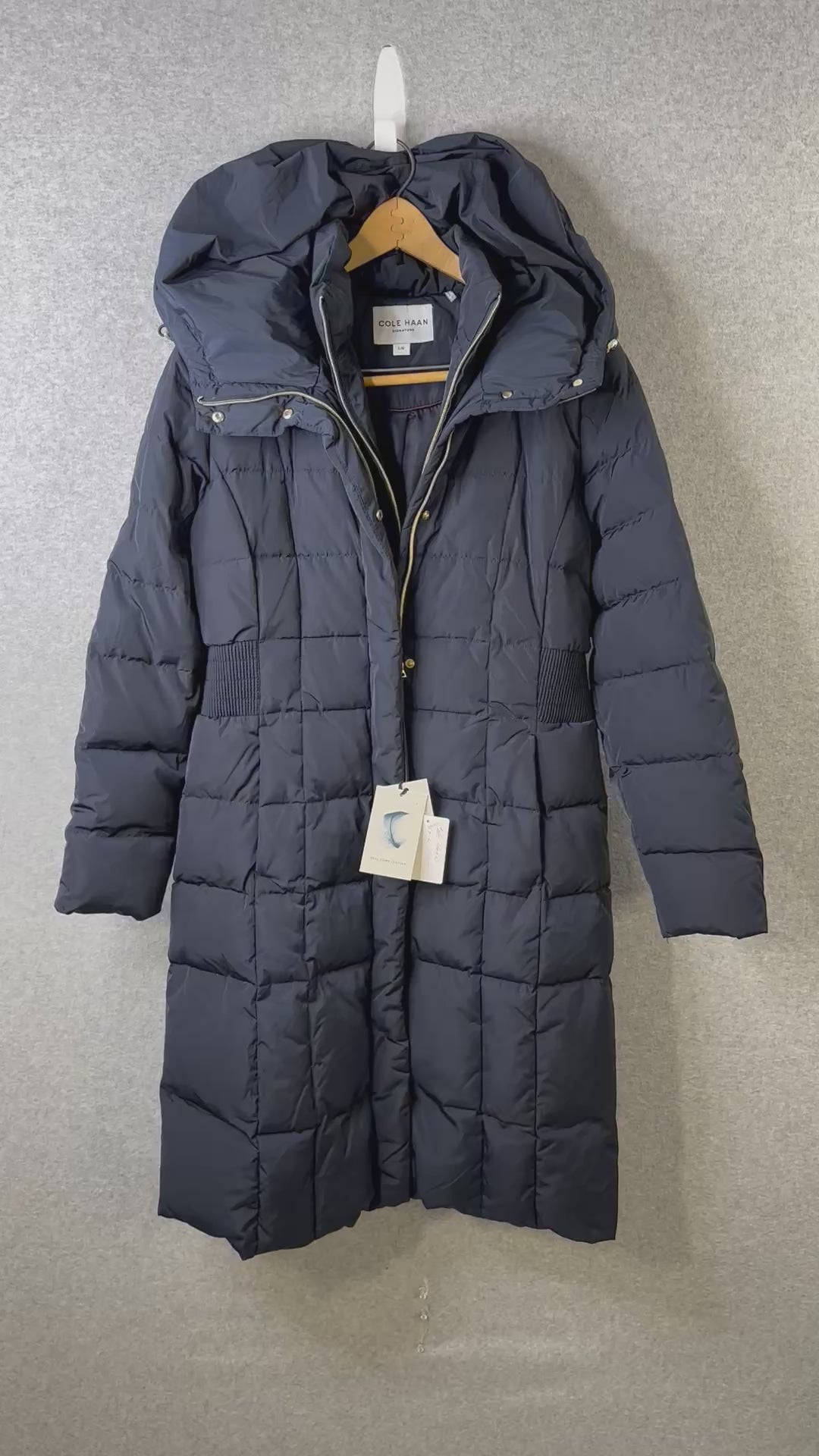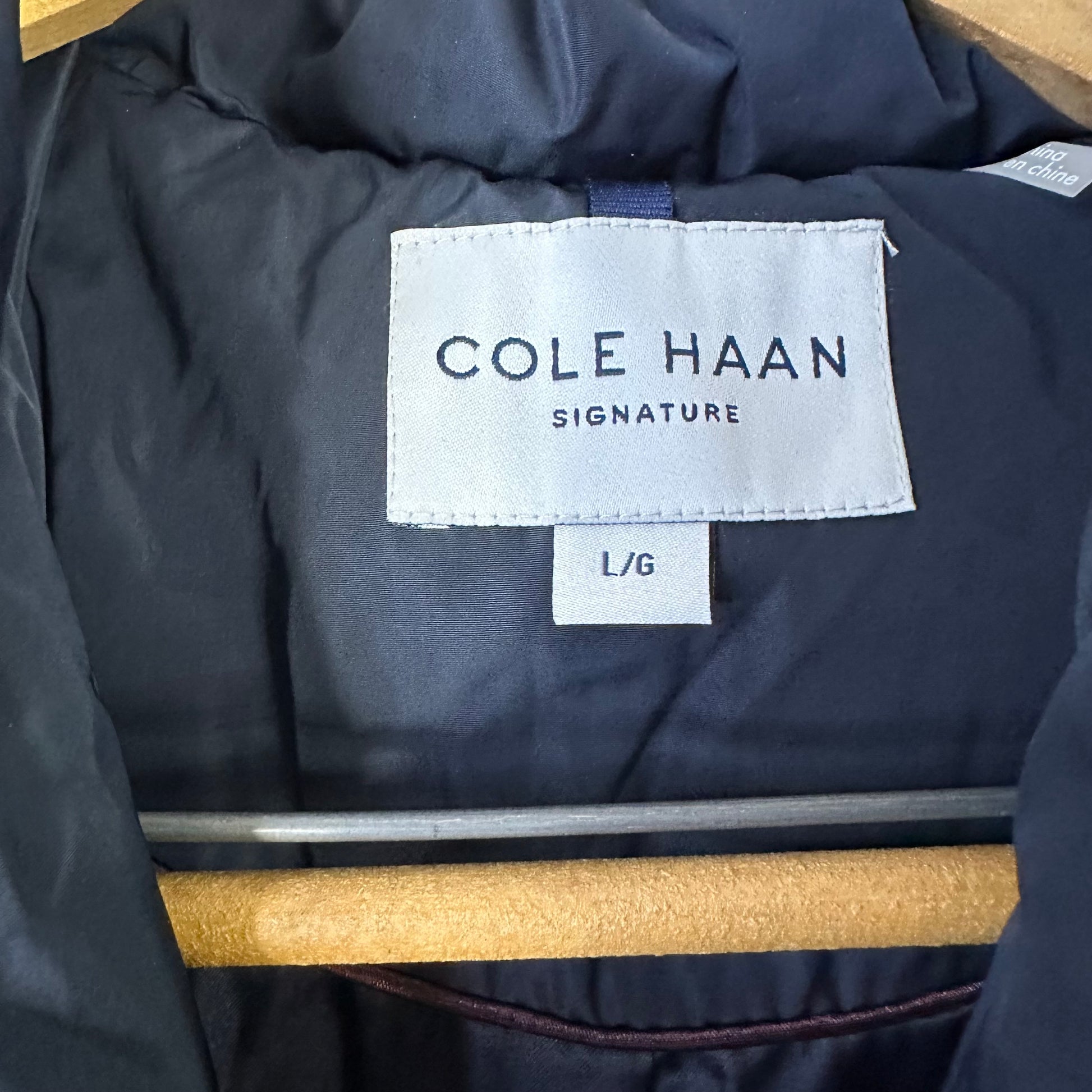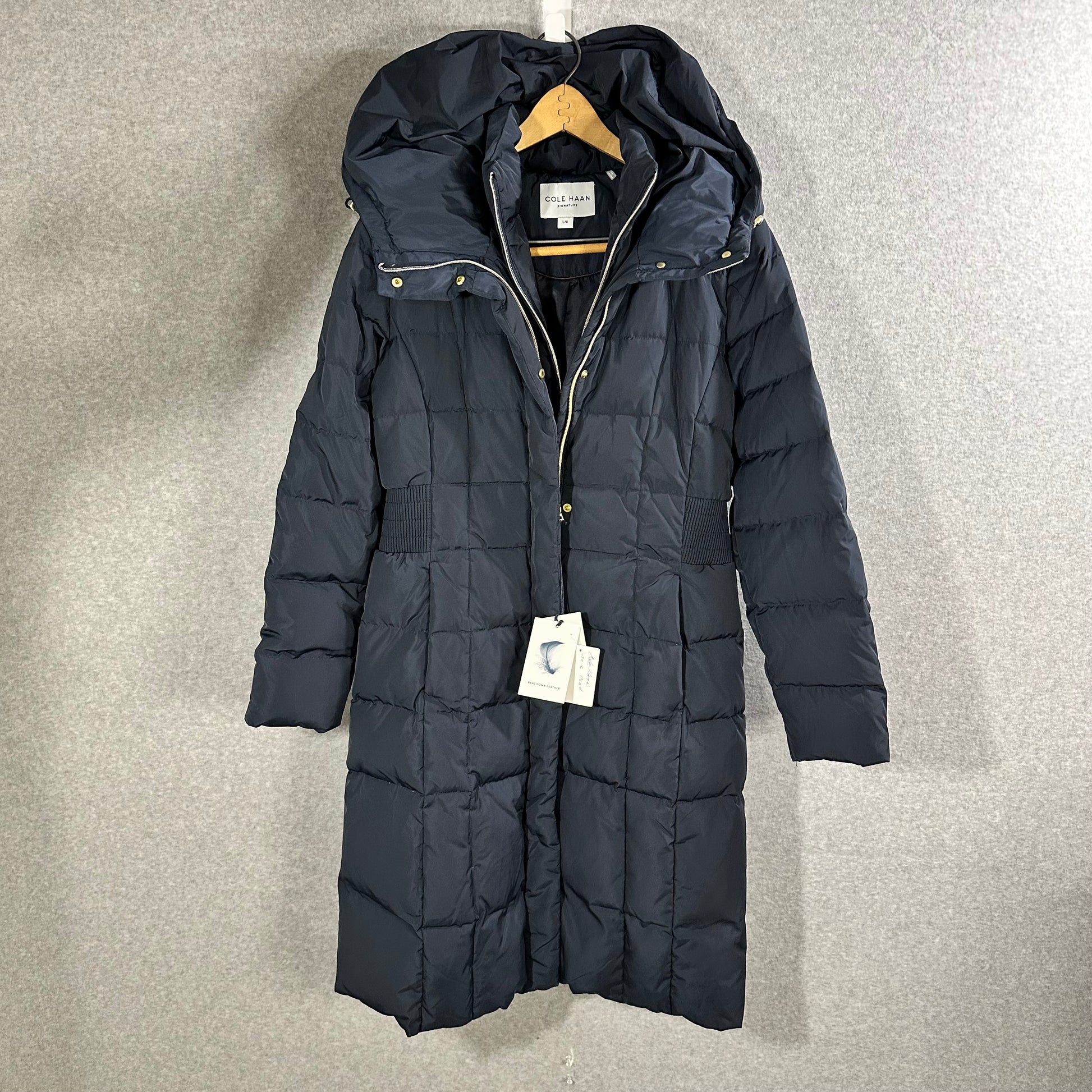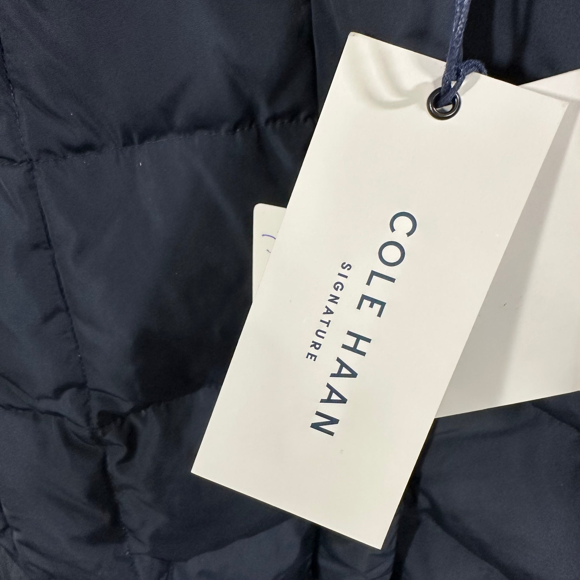 Cole Haan Down Puffer Coat Women's Size Large Hooded Parka Navy Blue - Good Depth On Pockets
