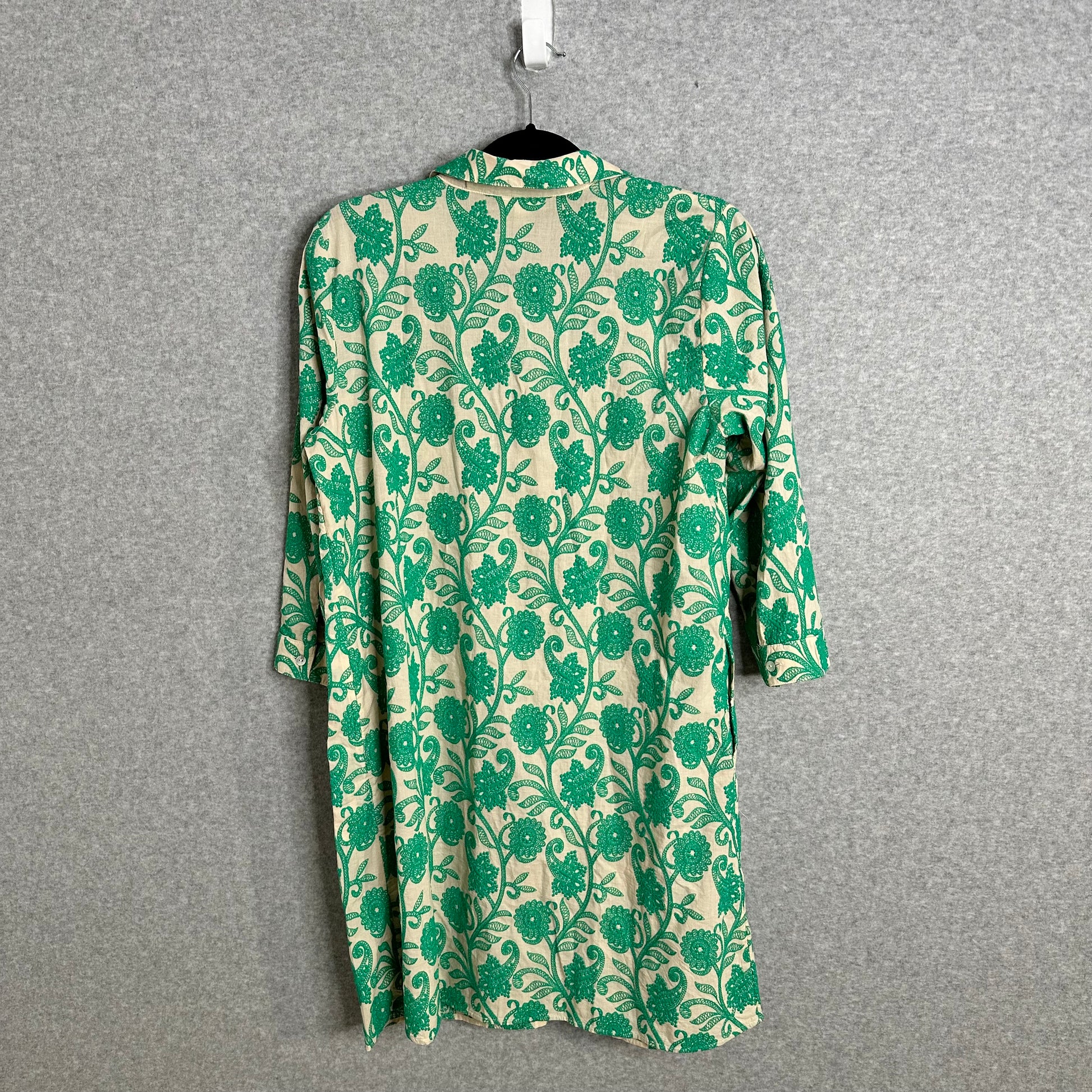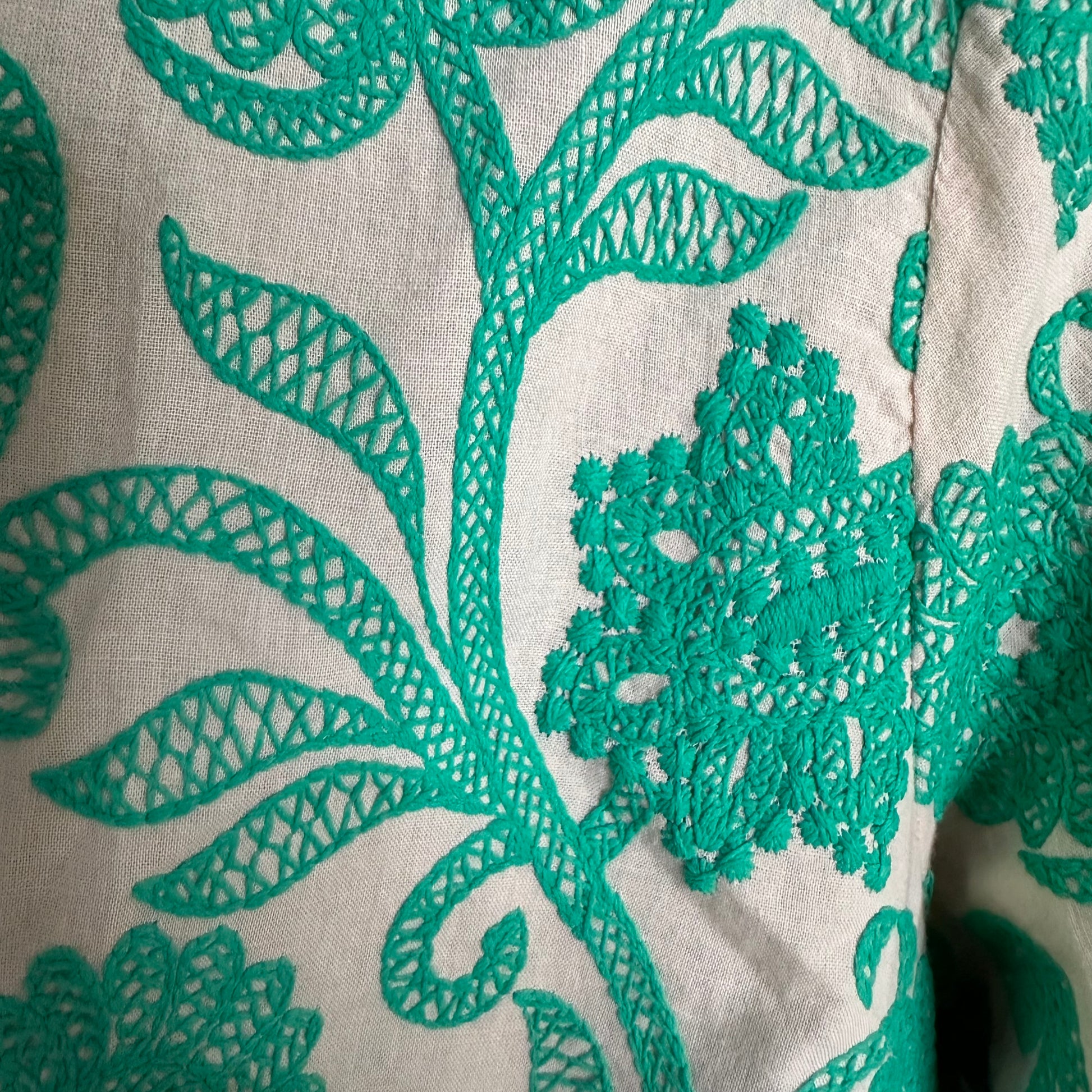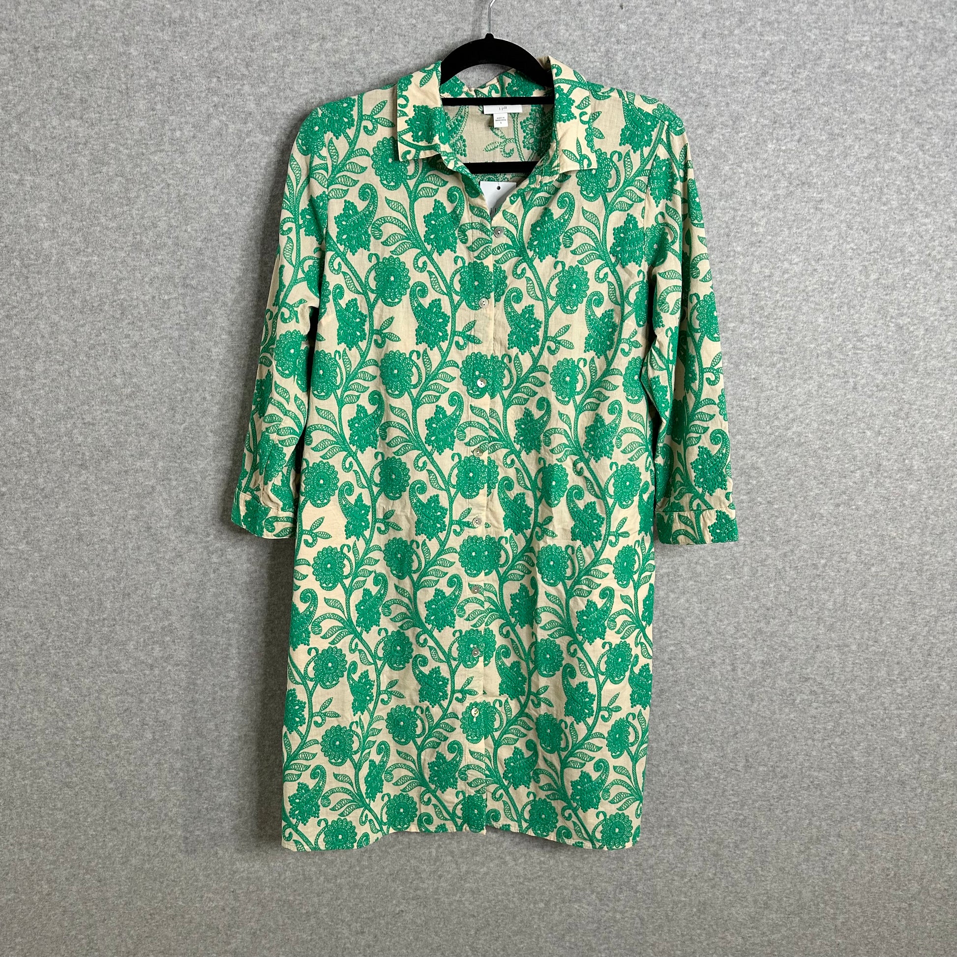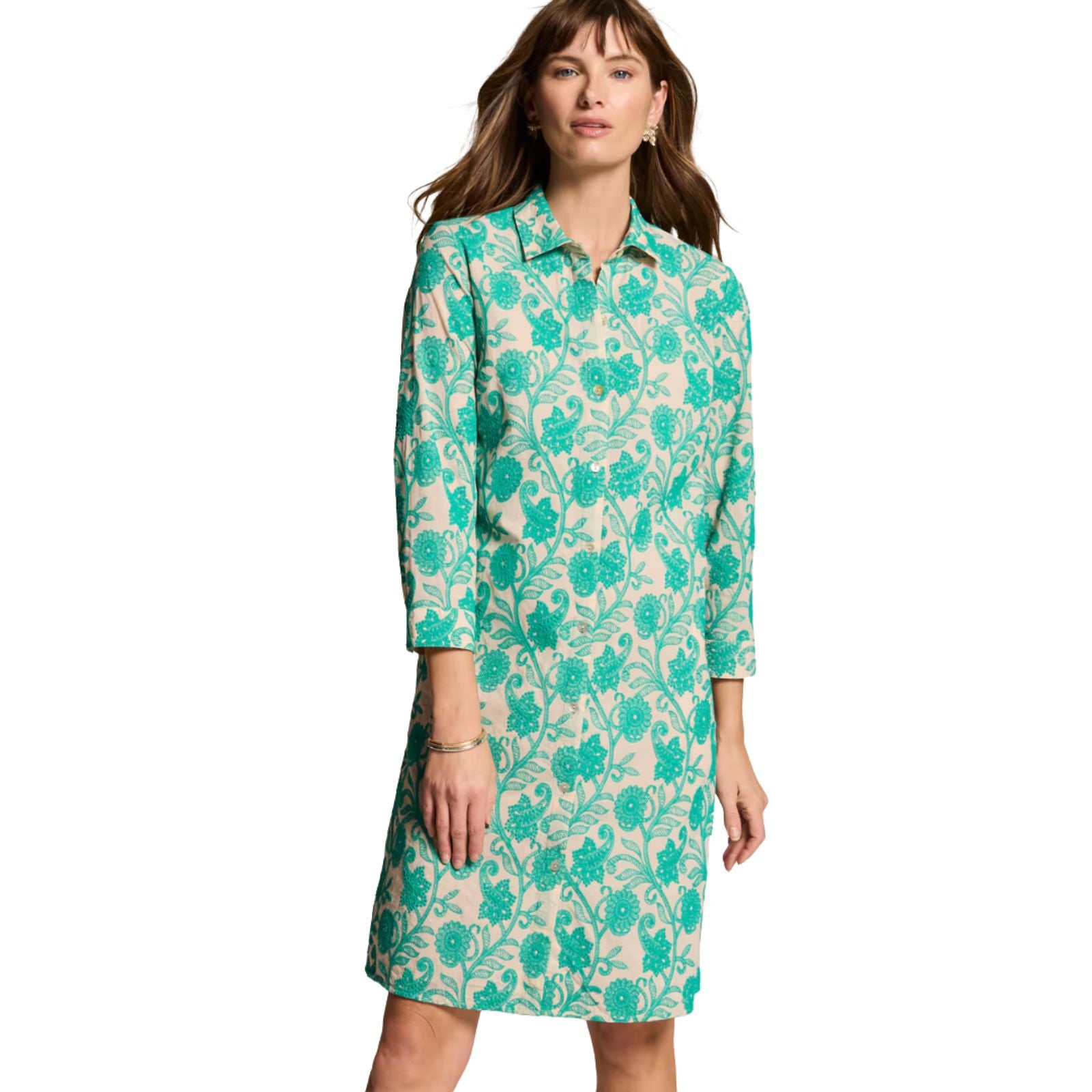 J. Jill Embroidered A-Line Midi Shirtdress Women's Small 3/4 Sleeve Pockets French Beige & Aquamarine