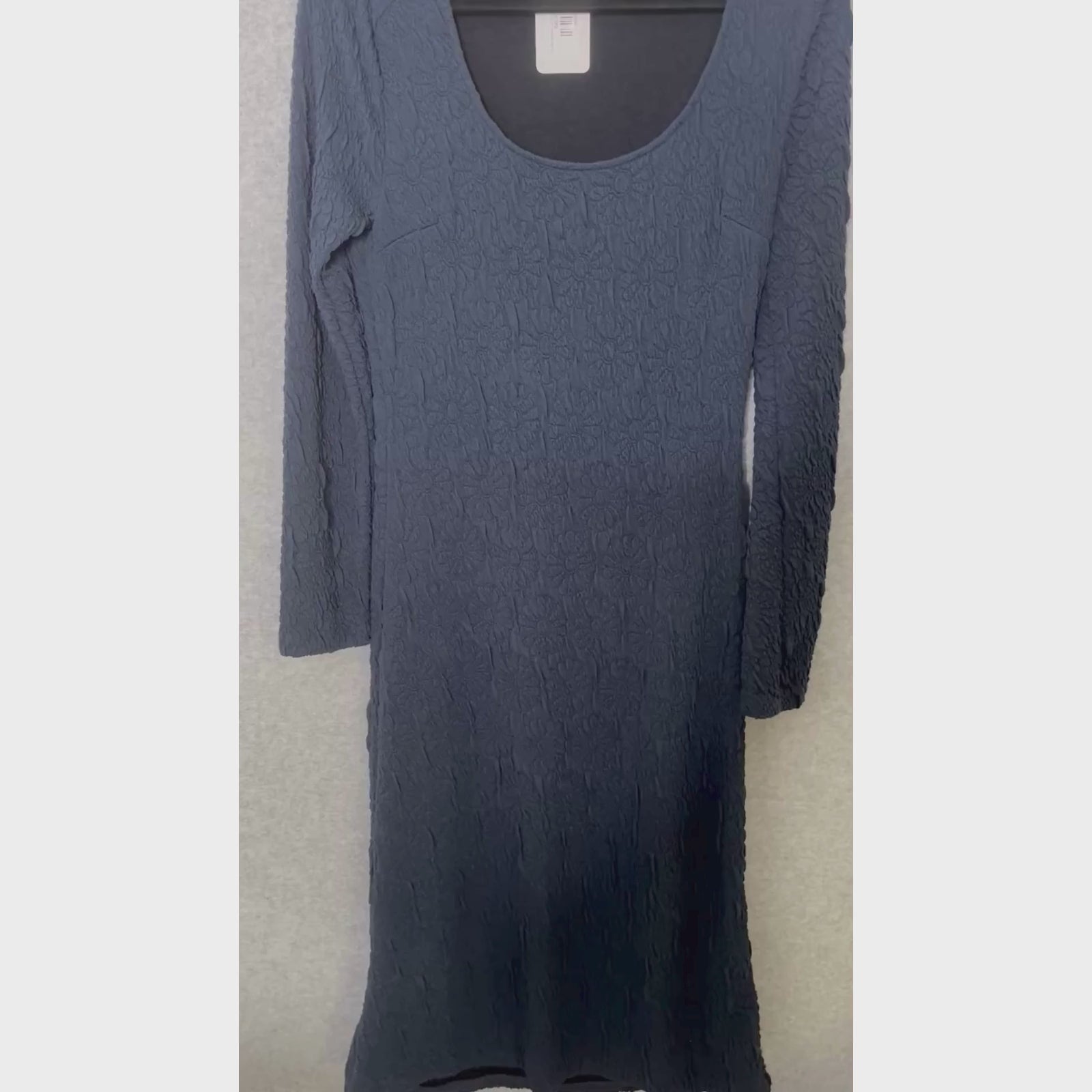 MSRP $290.00 The Orchid is a long sleeve midi dress, with a slim fitting A-line silhouette and flattering scoop neck in a textured floral stretch jersey that is navy blue in color.