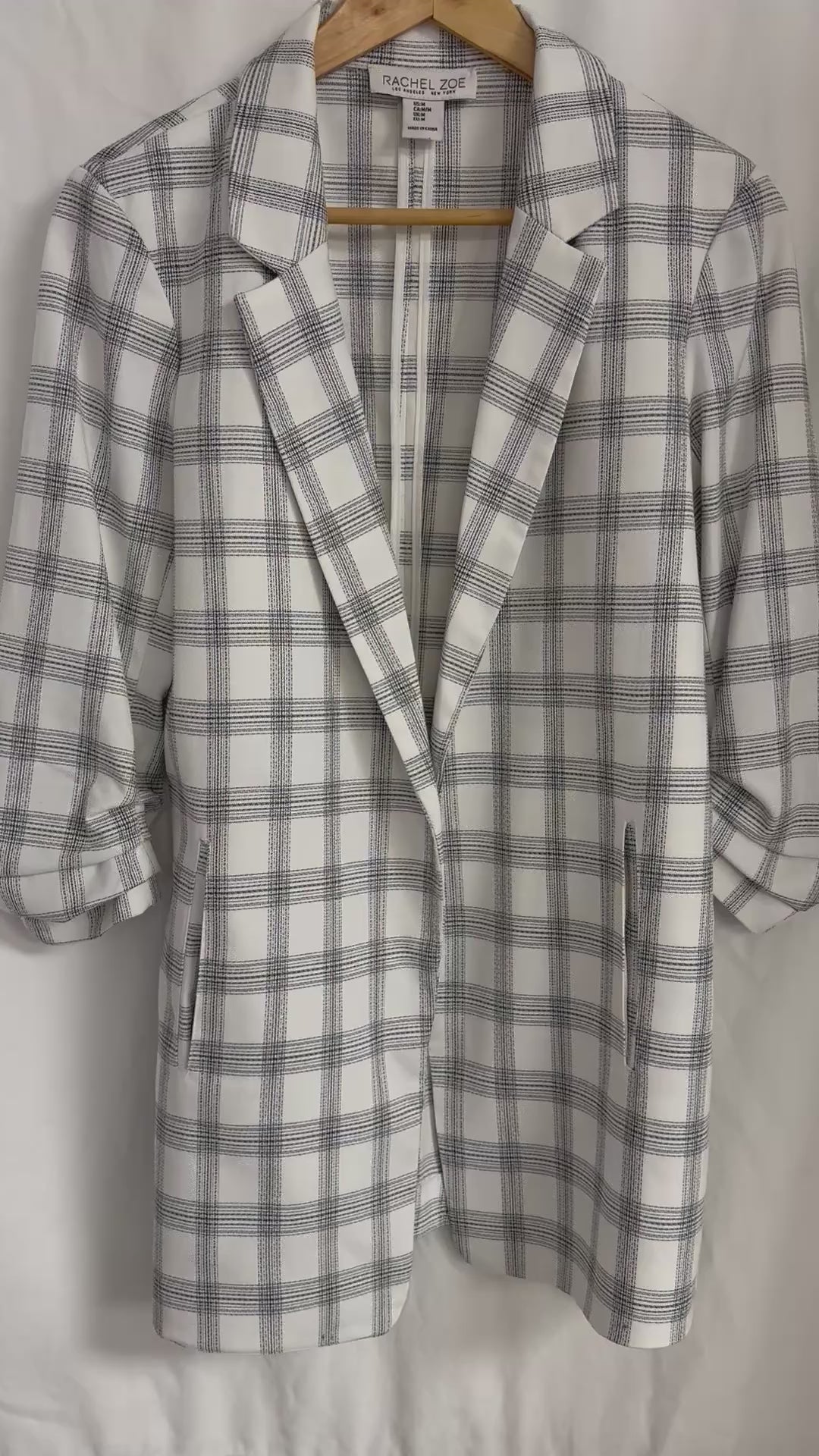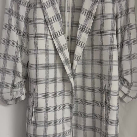 Rachel Zoe Plaid Blazer Women's Medium Relaxed Oversized Ruched 3/4 Sleeve Black And White