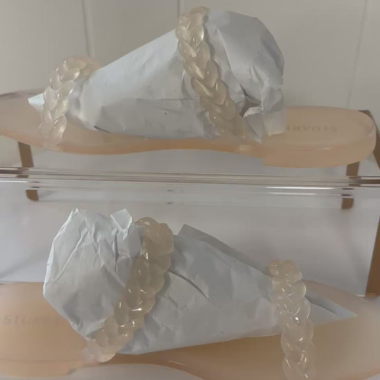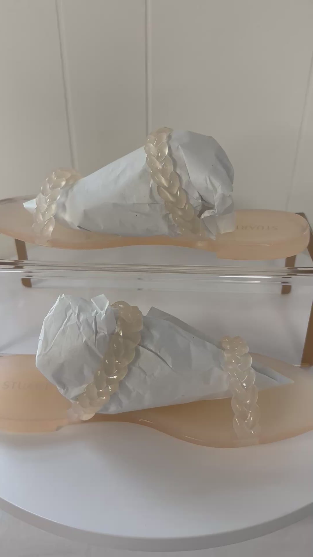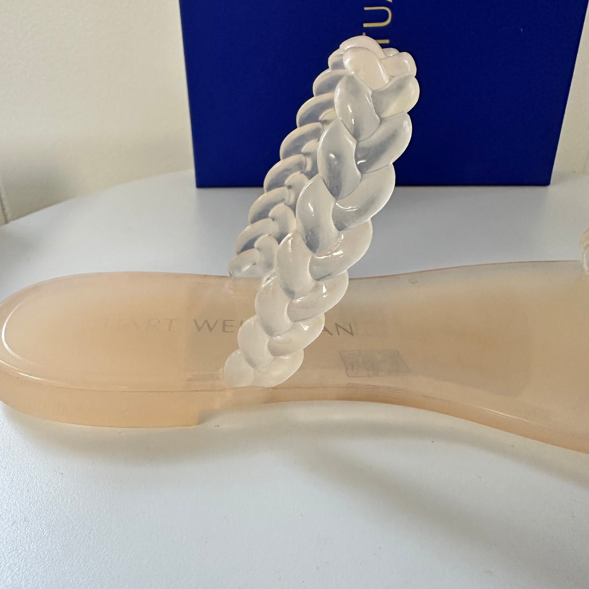 Stuart Weitzman's Braida Sawyer sandals are a open toe, slip-on jelly style with braided straps.