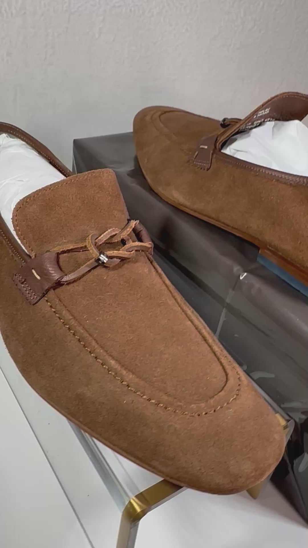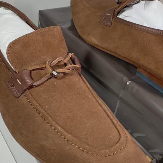 Elevate any look with these tan soft suede London SIBLIC loafers. A classic design updated with deconstructed detailing and striped panel at the back.